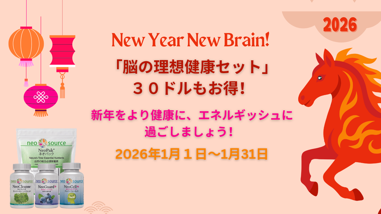 これら全ての製品が含まれる「脳の理想健康セット」(「ネオパック」、「ネオセルプラス」、「ネオガードプラス」、「ネオクレンズ」入り)で、体と脳に必要なすべての栄養素を確実に摂取することができます。「脳の理想健康セット」は、体と脳が、ストレス、痛み、病気、毒素から受ける影響を除去するのを助けてくれます。そして、あなたが2026年により健康に、幸せになるのをお手伝いします!
